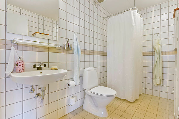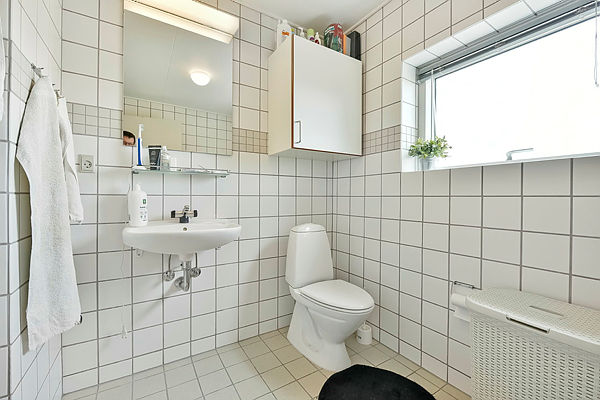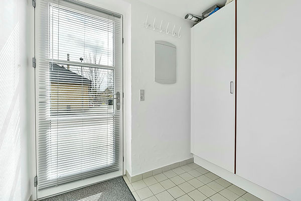 Der er faste garderobeskabe i soveværelse, entre og i nogle af værelserne. Der er opsat Invita køkken med glatte låger i vanillafarve samt forberedt for installation af opvaskemaskine og køleskab (max 55 cm bredt). Der er komfur med plader og ovn samt emhætte. Der er ligeledes forberedt installation til vaskemaskine og kondenstørretumbler. Der er lyse klinker i bryggers og badeværelset. I køkken er der linoleumsbelægning. I de øvrige rum er der parketgulve.