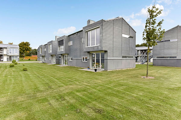 Boligerne ligger i grønne arealer og er omgivet af træer.